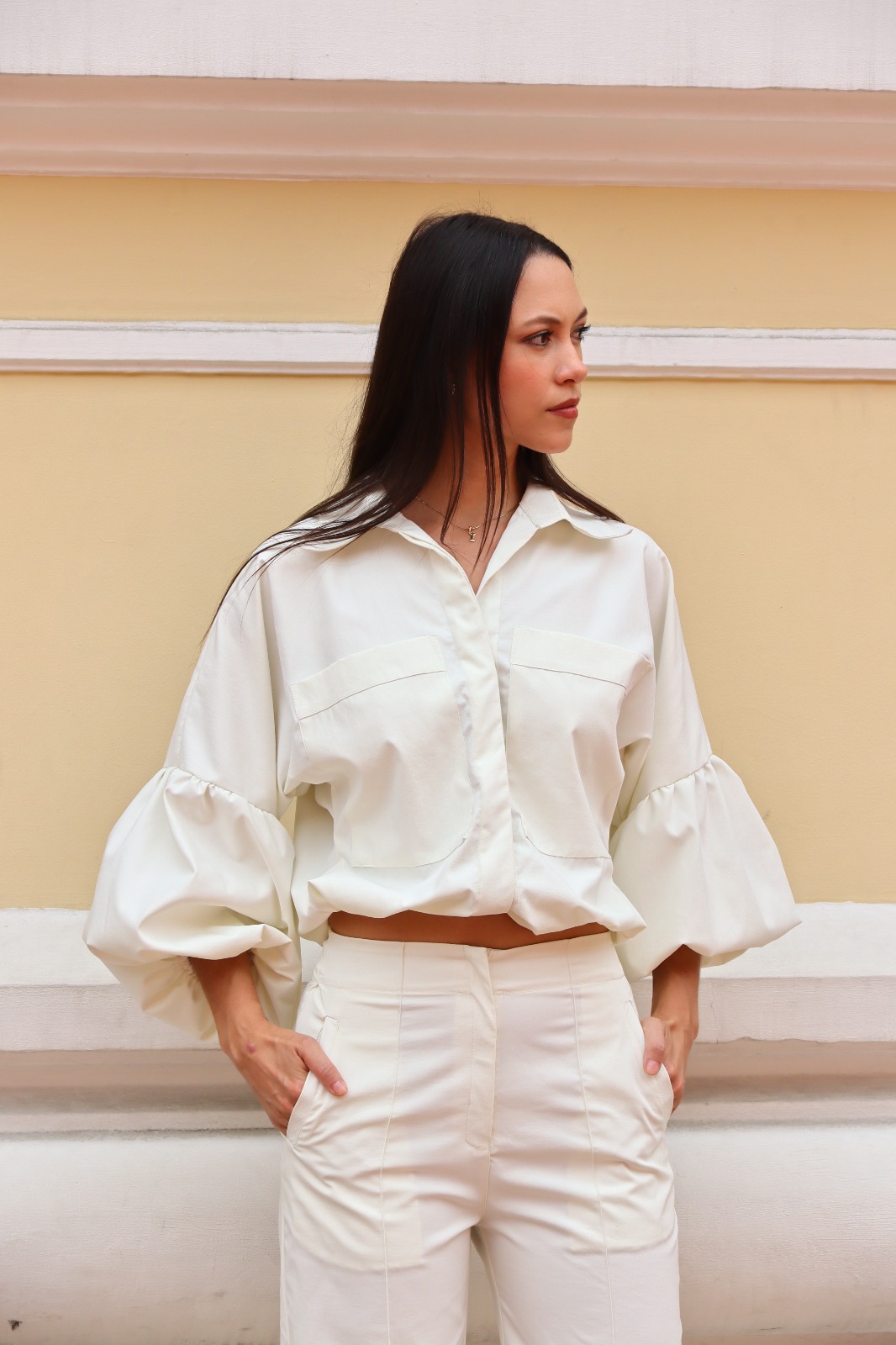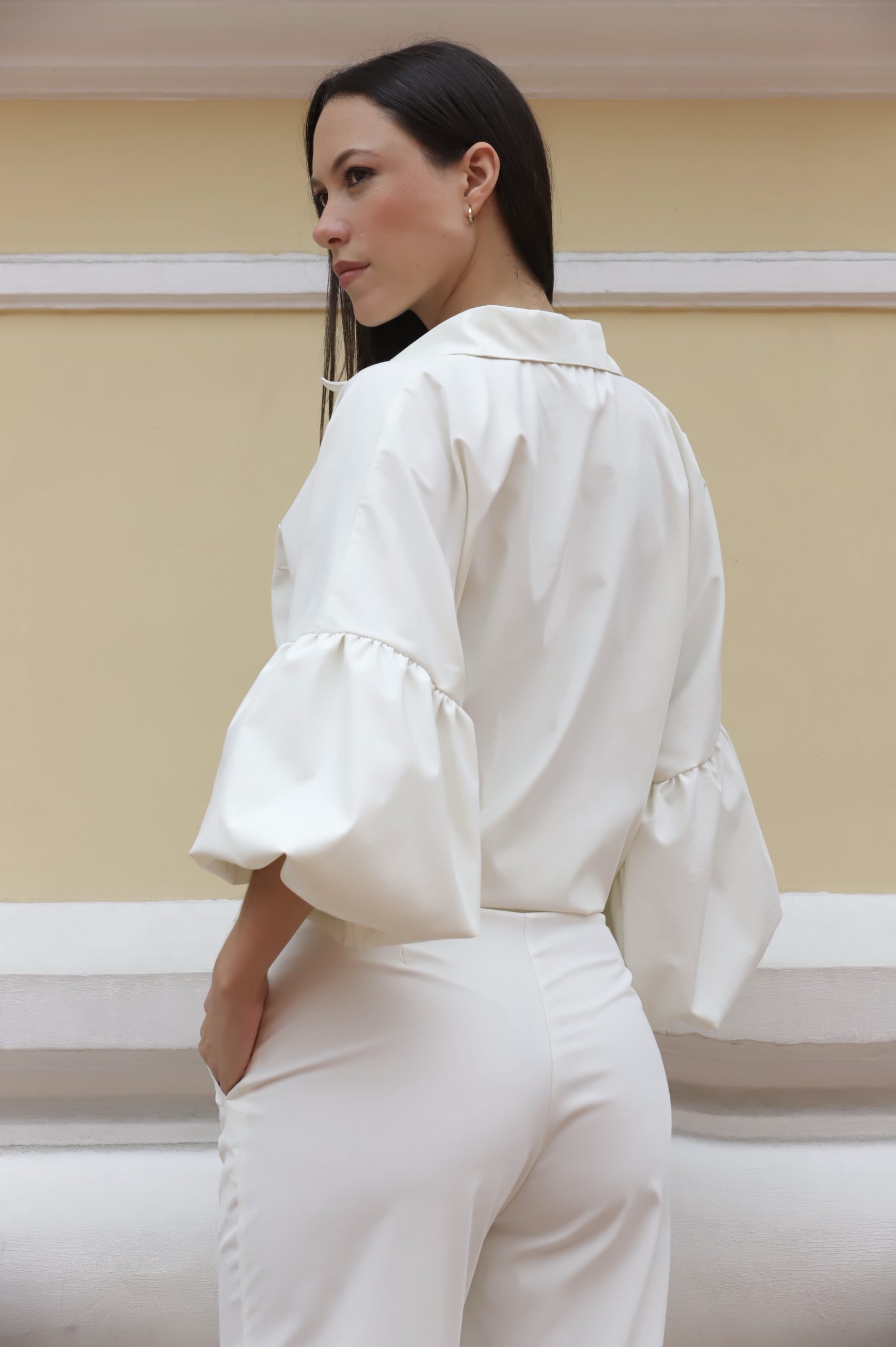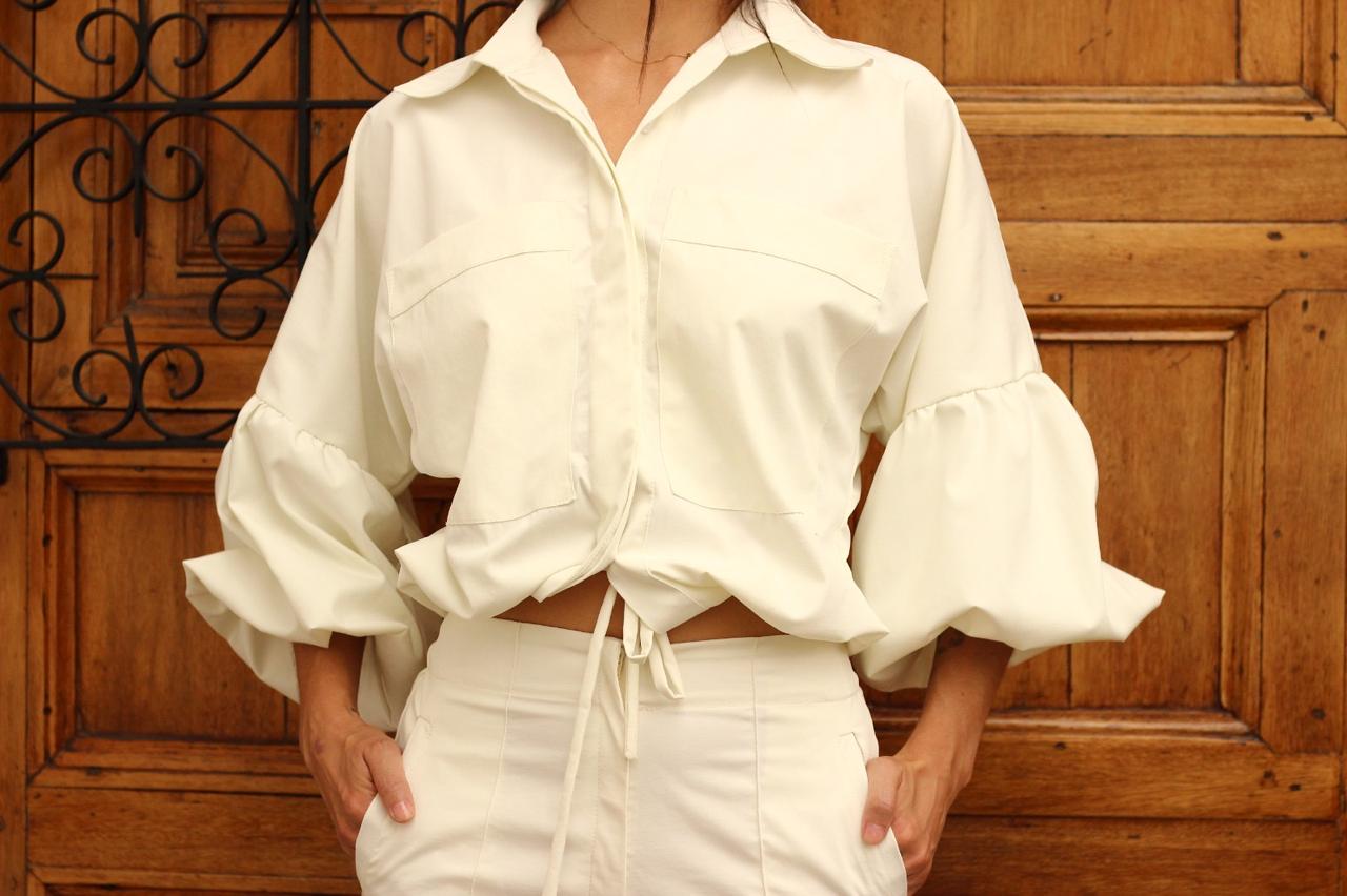 Diseño ajustable adelante, color blanco crema, mangas bombachas, botones internos, cuello camisero, espalda lisa, ajustable con cordón abajo.