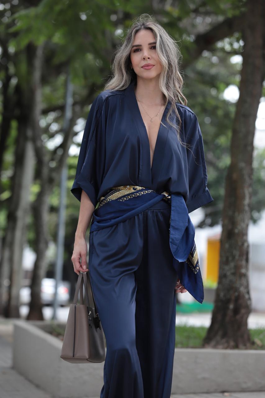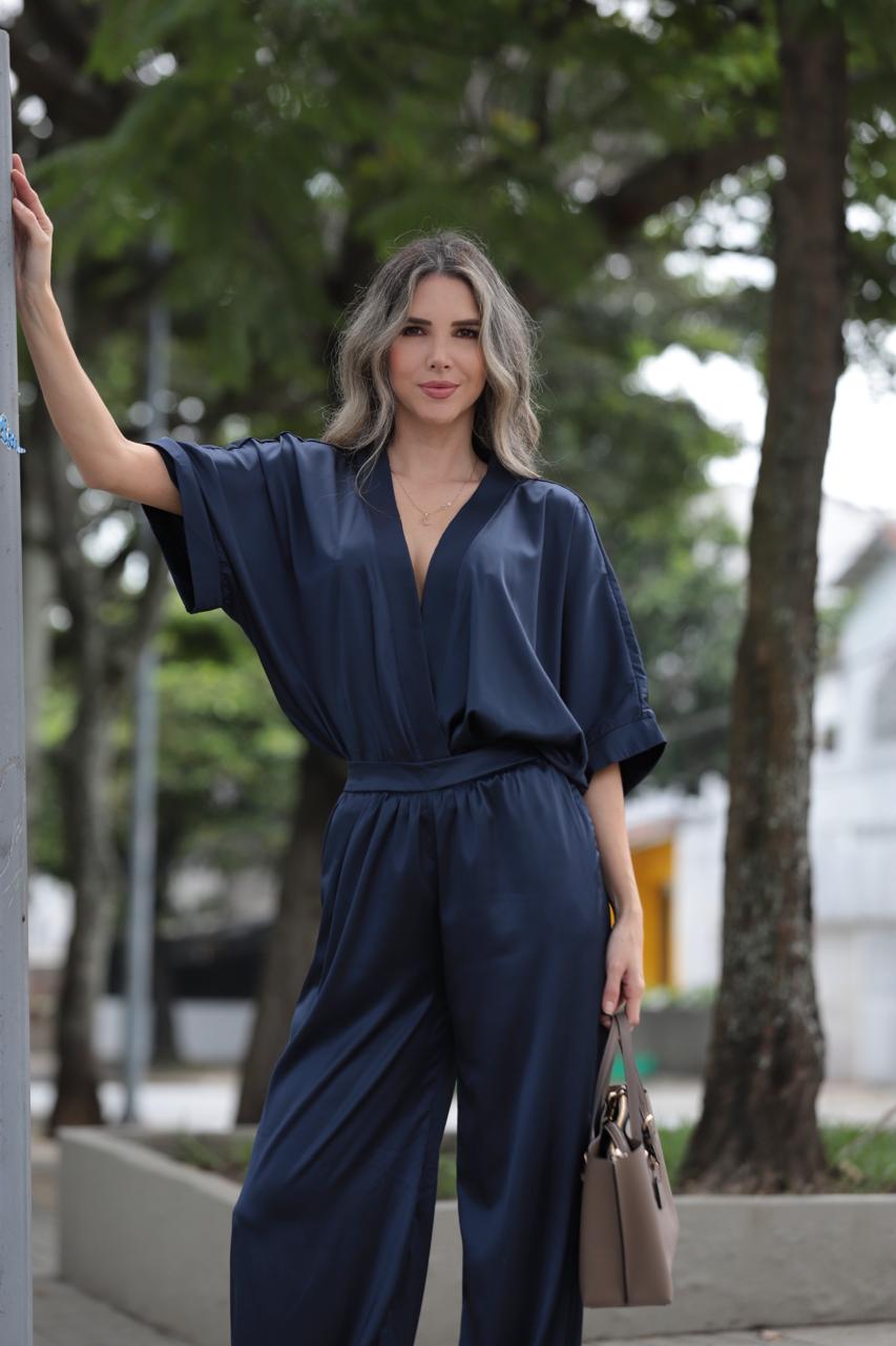 Blusa satinada, corte en V, diseño suelto mangas amplias, espalda lisa, color Navy satinado.