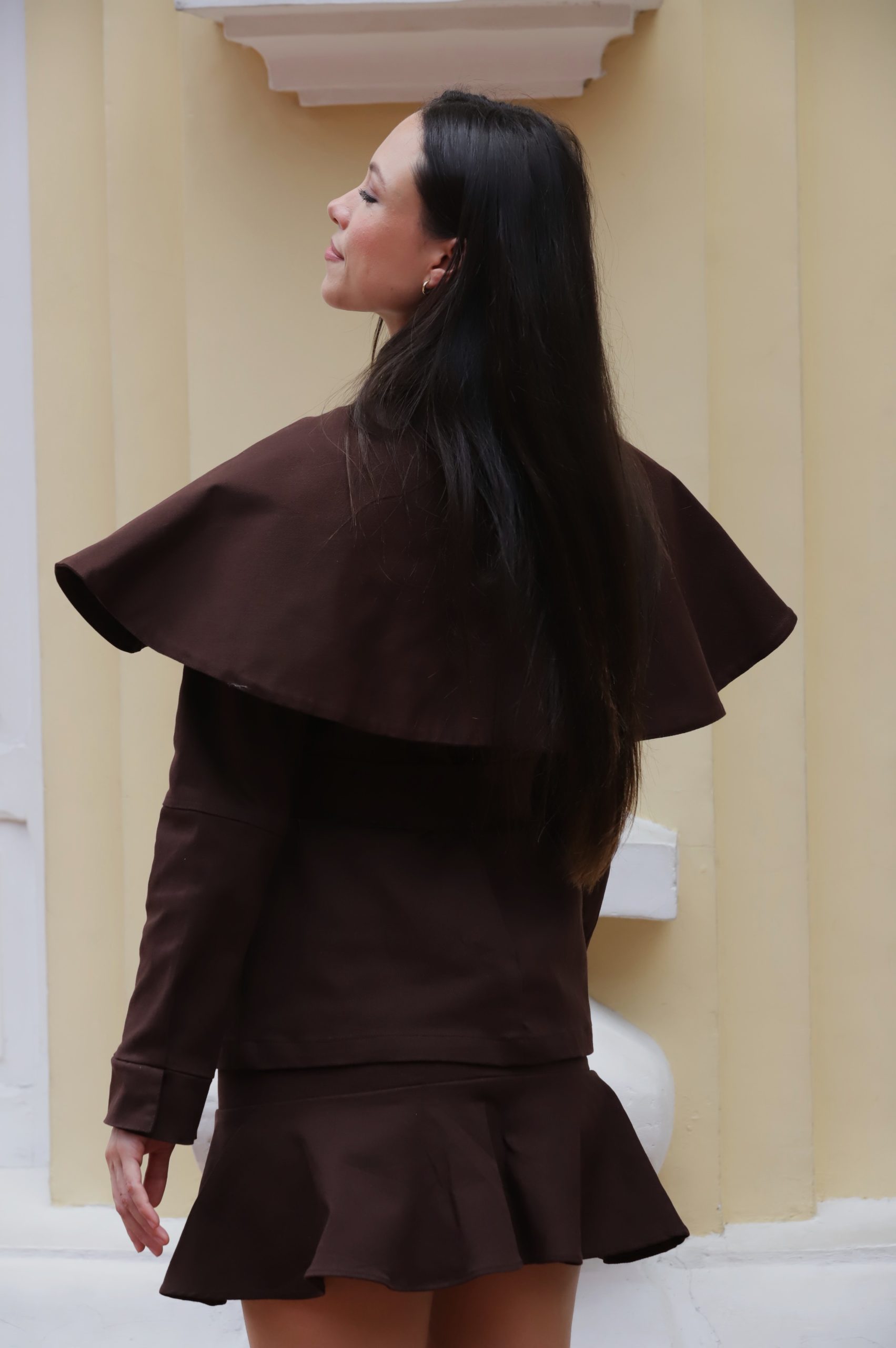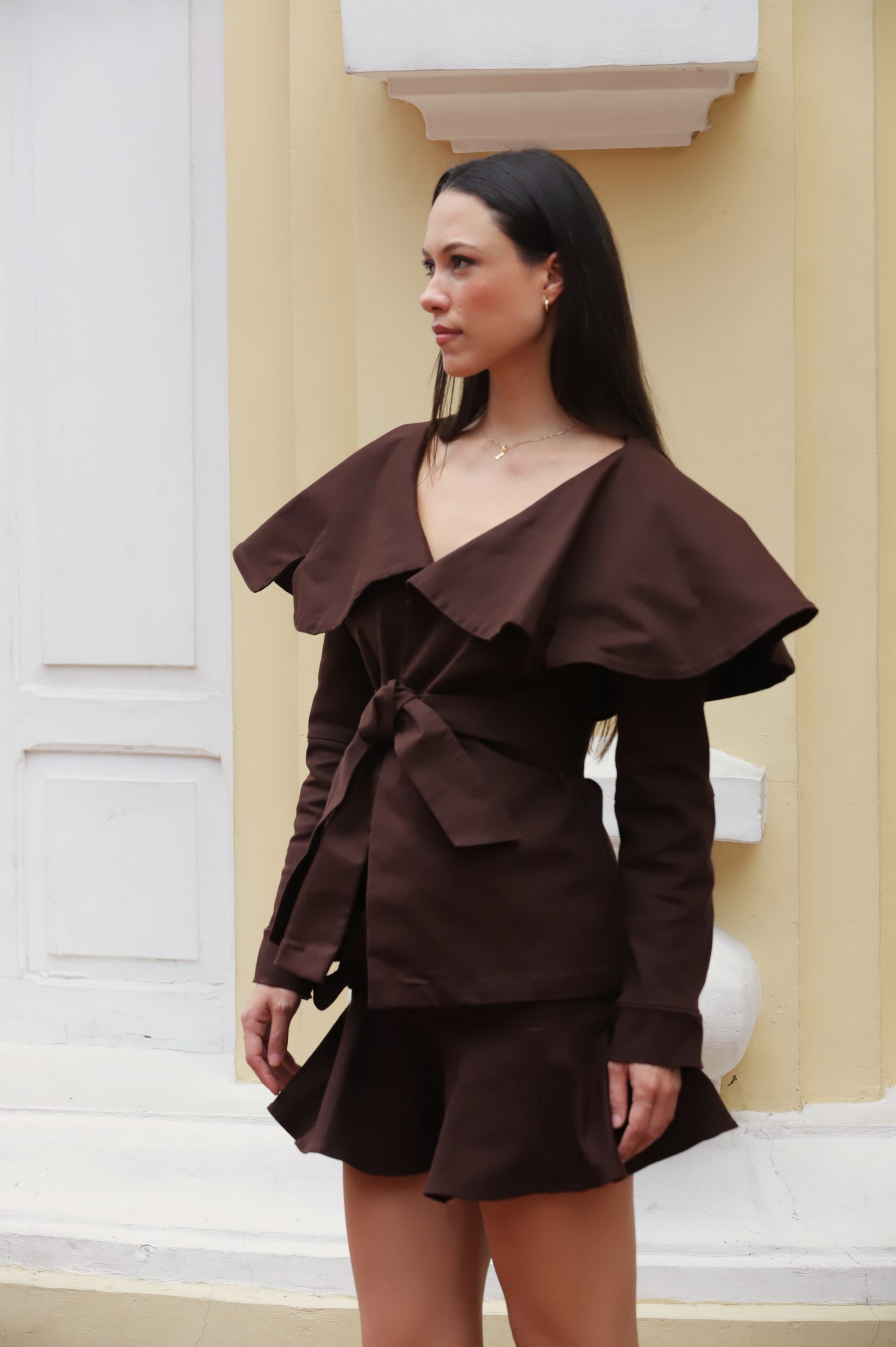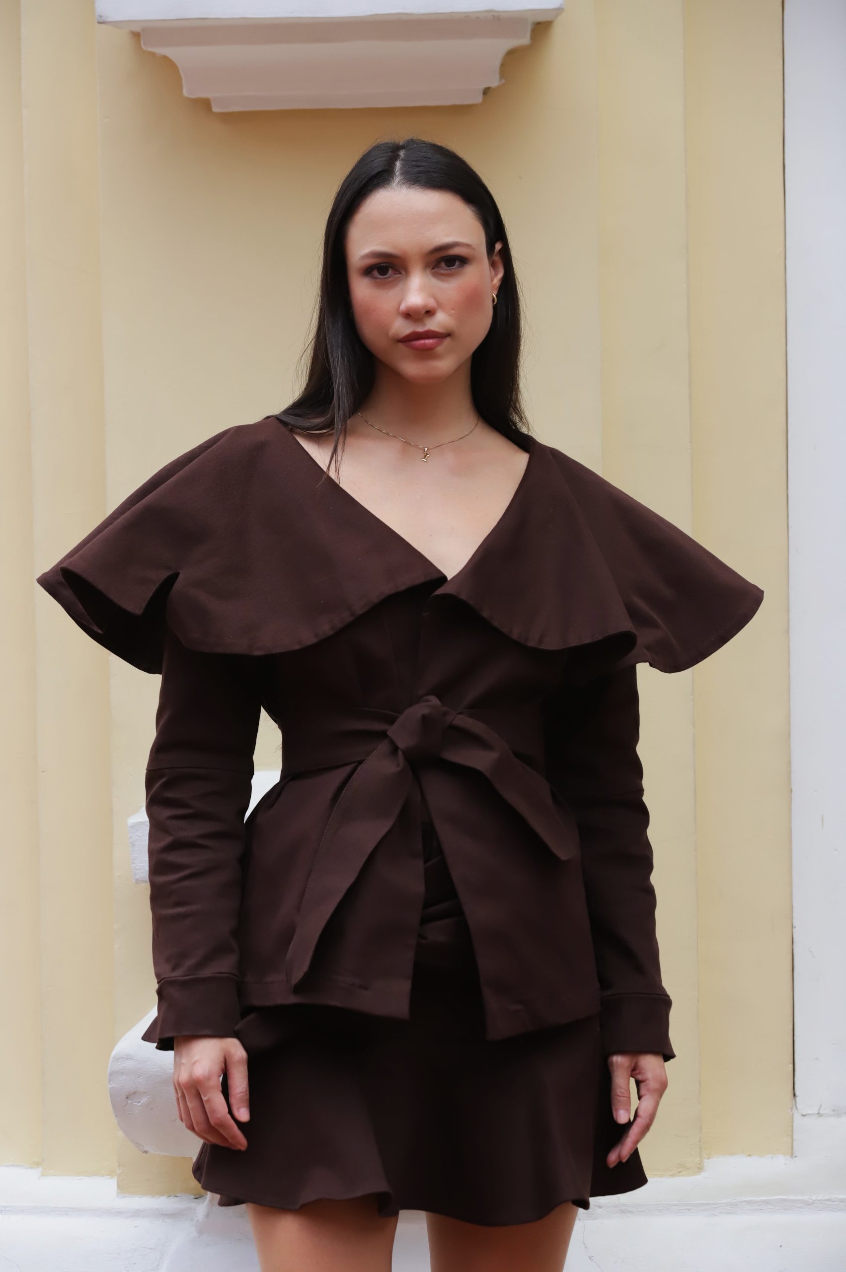 Chaqueta Terra, diseño con cinturón, hombros semi-caìdos, con estola que bordea los hombros, espalda lisa, cuello en V, color chocolate.