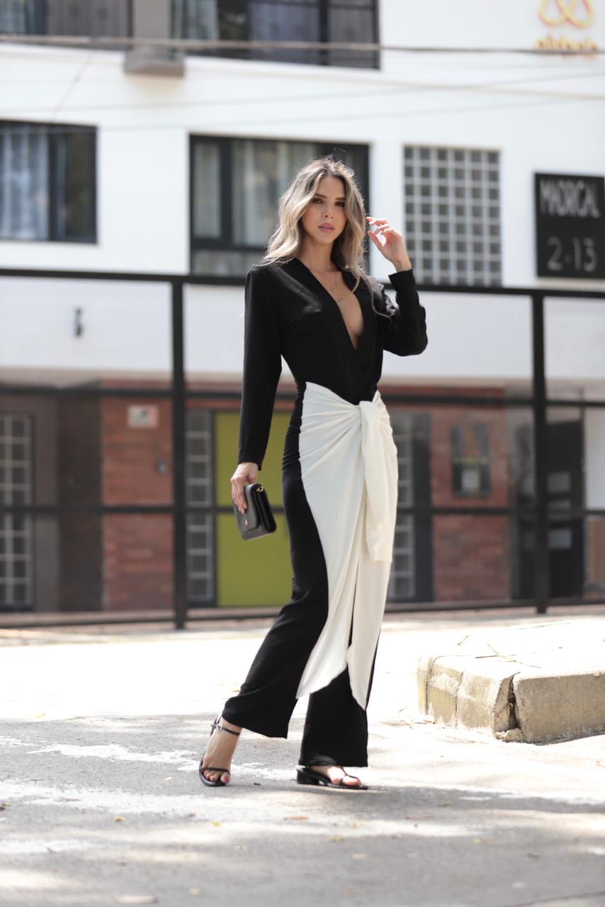 Enterizo doble color, blanco y negro, diseño manga larga, escote sutil delantero, amarre en frente, espalda lisa, tela suelta tipo hindú.
